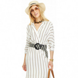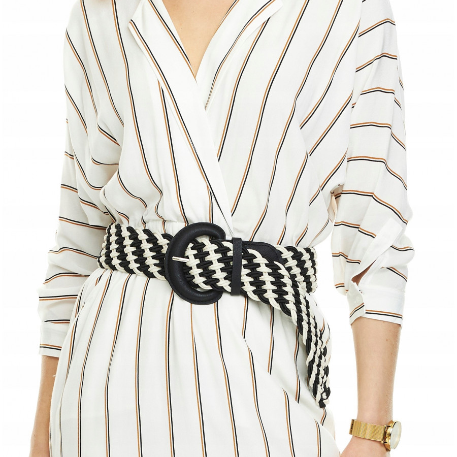 Pleciony pasek damski, w kolorze jasnego beżu oraz czerni.