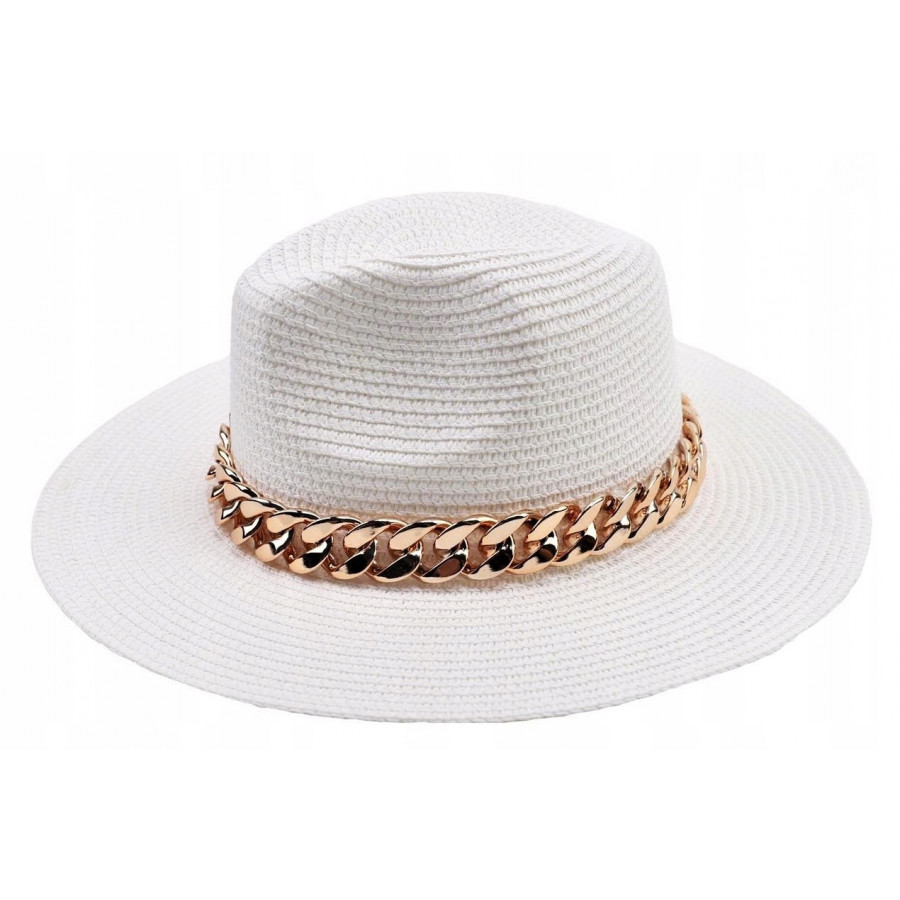 Kapelusz wokół ronda zdobi łańcuch w kolorze różowego złota.