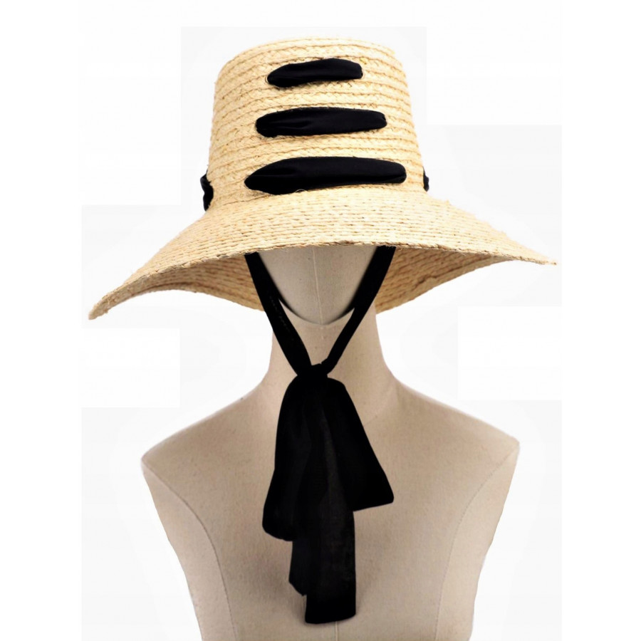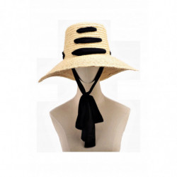 Dekoracyjnie zdobiony zwiewną taśmą w kolorze czarnym.