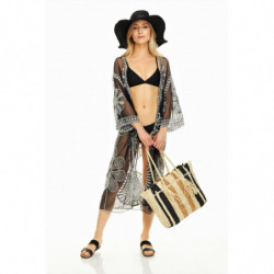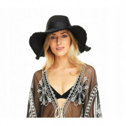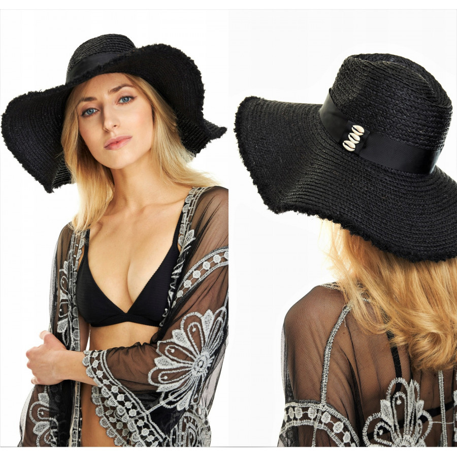 Dekoracyjnie zdobiony czarną szeroką taśmą z muszelkami.