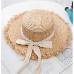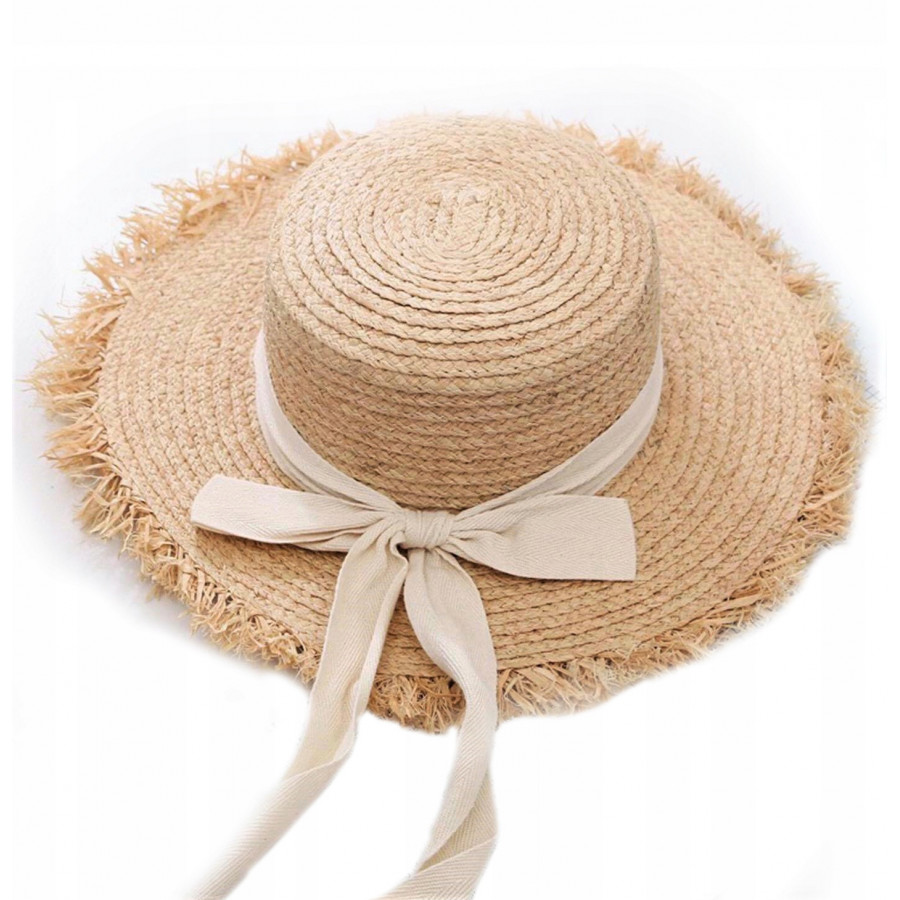 Kapelusz zdobi lniana kokarda w kolorze jasnego beżu.