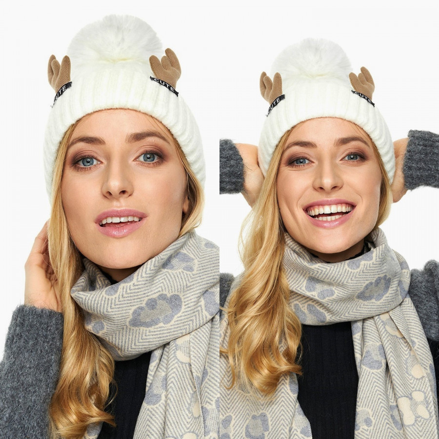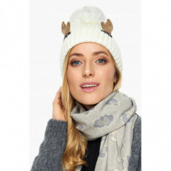 CZAPKA ZIMOWA duży pompon rogi renifera ecru
