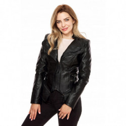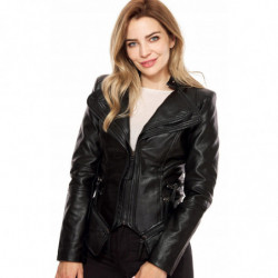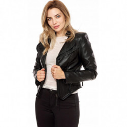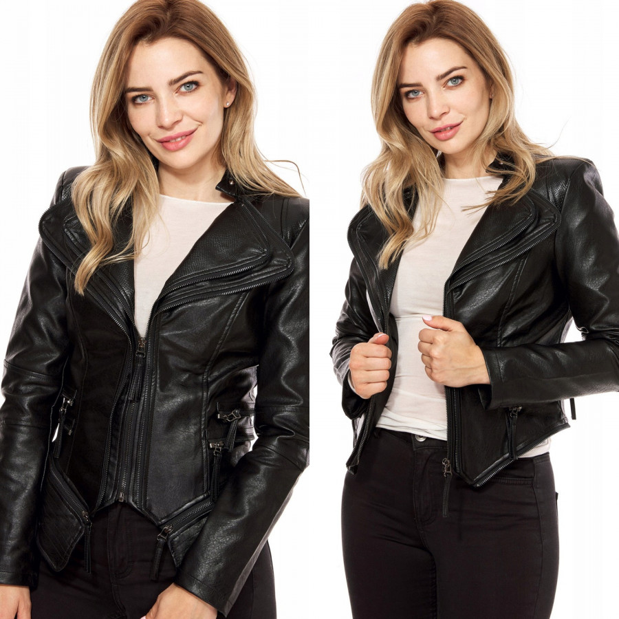 Kurtka damska, wykonana z wysokiej jakości eko skóry, do złudzenia przypominająca skórę naturalną, dzięki specyficznym jarzmowaniom widocznym na materiale.