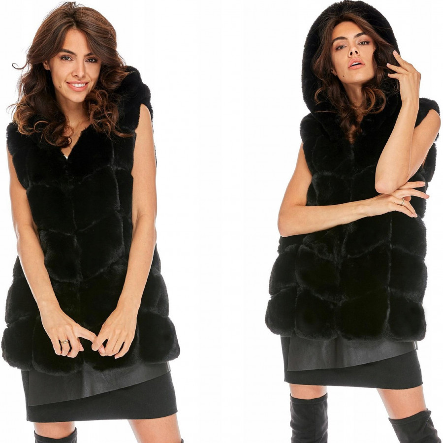 CZARNA KAMIZELKA FUTRZANA futro kaptur w jodełkę S